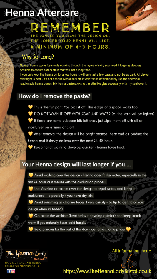 - If you need to get rid of your henna or jagua quickly or (or when it starts to fade) – GO FOR A SWIM AT YOUR LOCAL BATHS! Chlorine will remove the henna design very quickly. Salt water also has the same effect. So, if you have a design for holidays you must protect it with Vaseline when swimming.